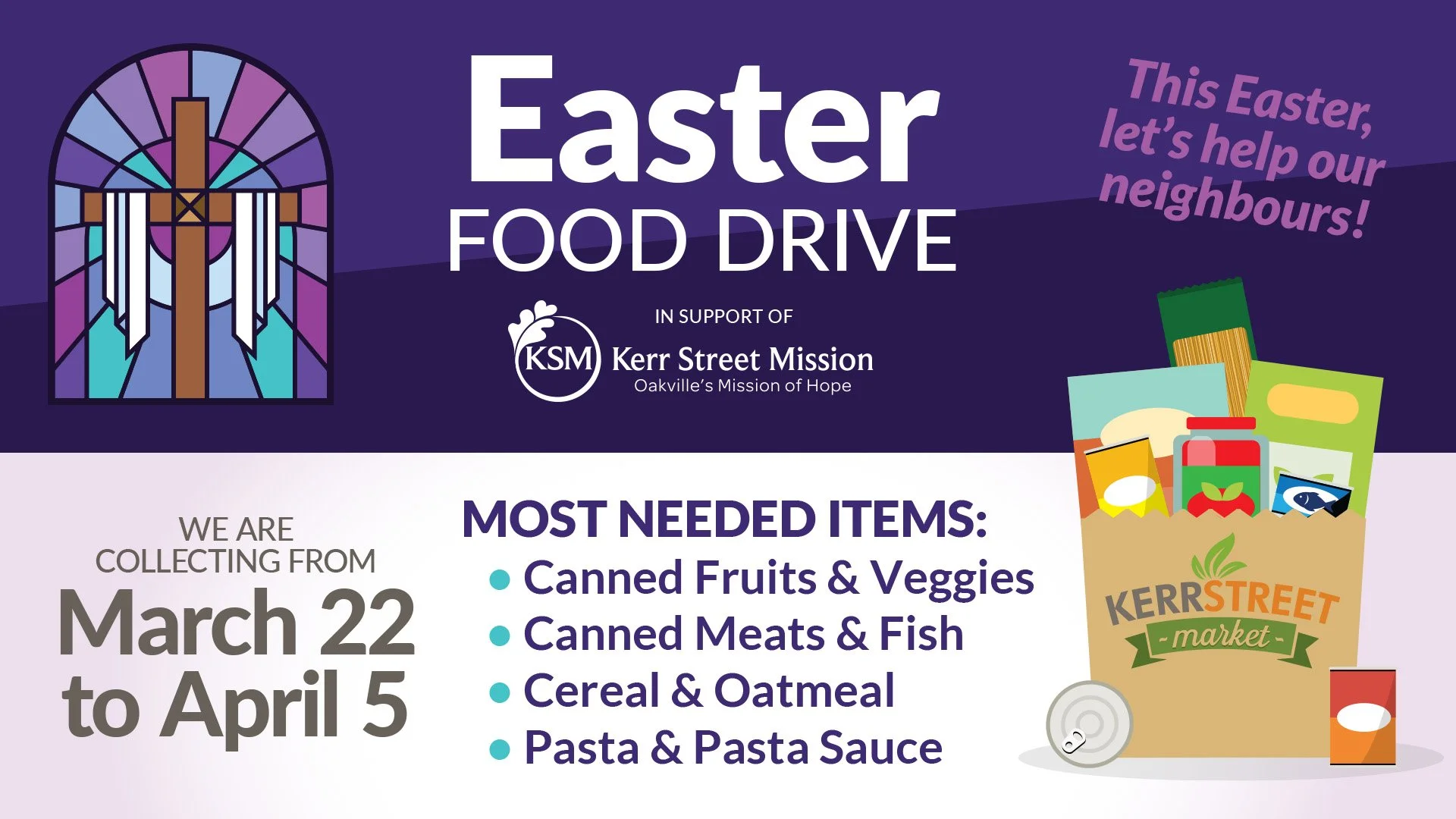 From March 22 through Easter on April 5, we will be gathering needed items for an Easter Food Drive. See poster below for a list of the needed items and fill the bin at the church.