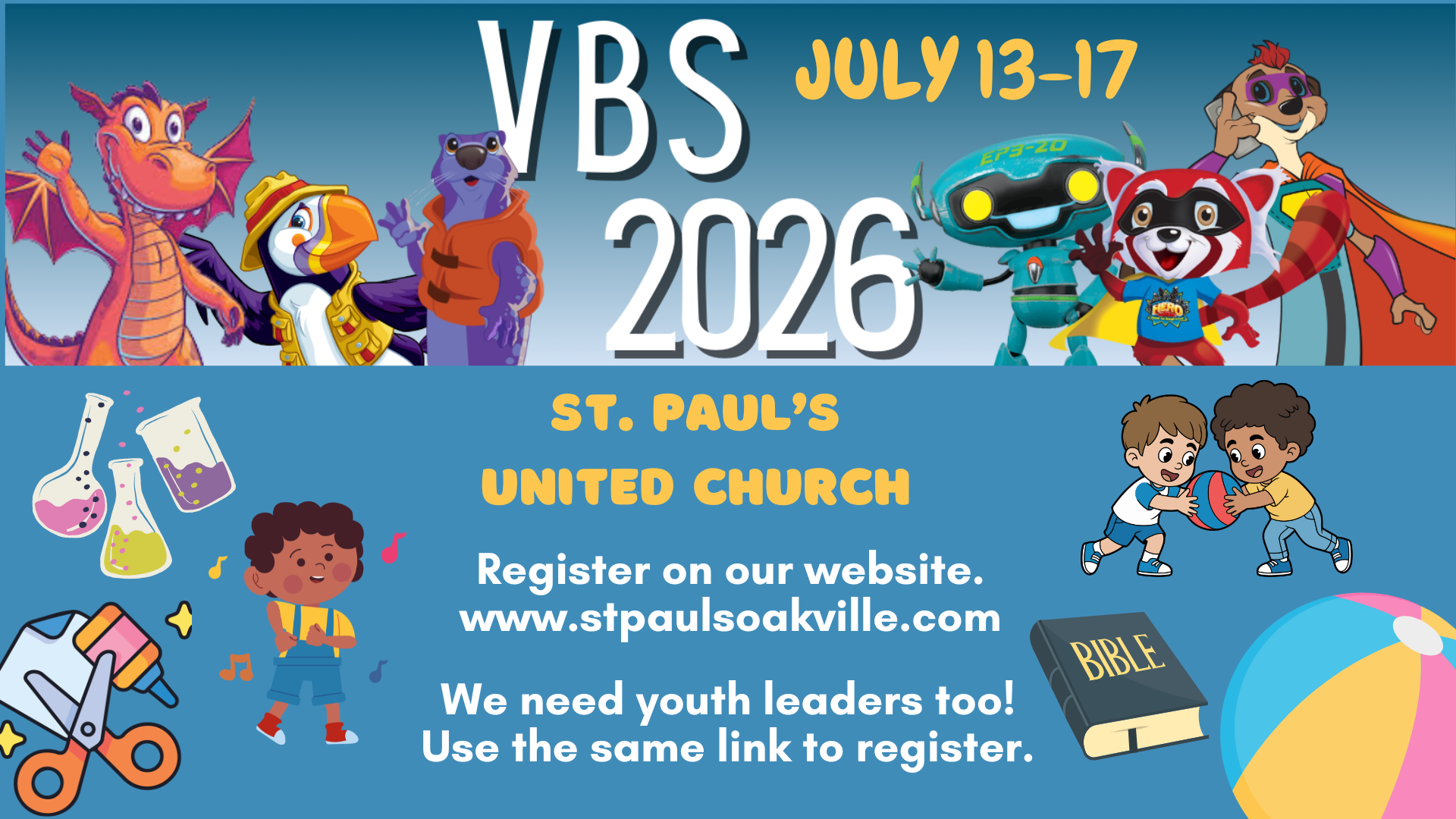 VBS Day Camp (July 13-17) & Youth Leadership Retreat (June 5-7) - - Registration is open now. See more details here.